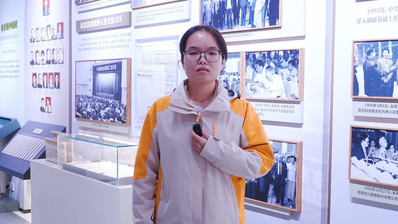 易婧卓同学谈了参加本次实践教学的收获:这堂行走的“中国政党制度”大思政课让我收获颇丰,深受启发。以往在课堂上学习习近平新时代中国特色社会主义思想,更多是从书本和理论层面去理解;而这次走进四川政协文史馆,通过参观馆内的珍贵文物、历史图片和文献资料等,让我将所学的理论知识与具体的历史实践和现实场景联系起来。这种沉浸式的学习方式让理论变得更加生动鲜活。此外,参观过程中,我深刻体会到了时代赋予我们这一代人的责任和使命。作为新时代的青年,我们肩负着实现中华民族伟大复兴的历史重任。通过这堂行走的思政课,我更加明确了自己的努力方向,要将个人的成长与国家的发展紧密结合起来,努力学习知识和技能,提高自身素质,为国家的繁荣贡献自己的力量。同时,我也意识到要积极参与社会实践,关注社会热点问题,像政协委员们一样,为解决社会问题、推动社会进步建言献策。